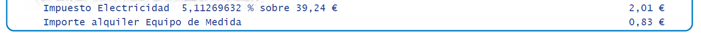 ✅ Impuesto eléctrico: el 5,11269632% de 39,24€ (11,78€ + 27,46€) = 2,01€