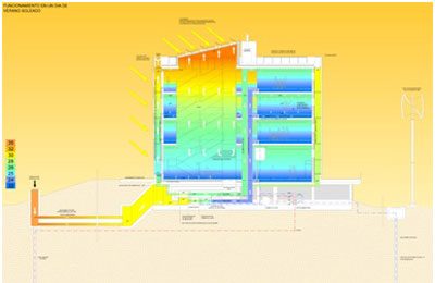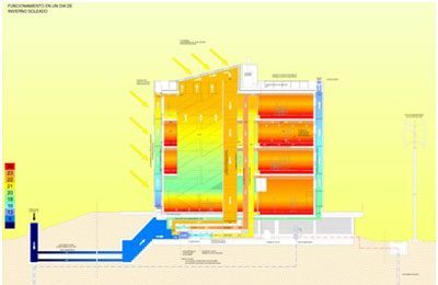 Debido a que en Zaragoza existen temperaturas extremas en verano y en invierno, el edificio capta o rechaza el calor exterior, lo almacena y se distribuye en el momento adecuado.